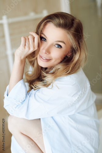 Beautiful young sexy girl in a shirt smiling and looking at the camera
