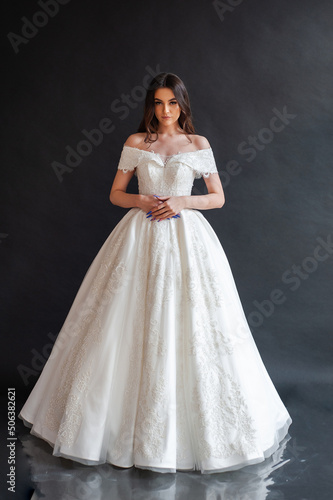Beautiful young sexy model female bride with dark hair in gorgeous glossy long light wedding dress posing in dark studio