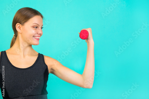 beautiful young slim woman in sportswear on a green background with dumbbells