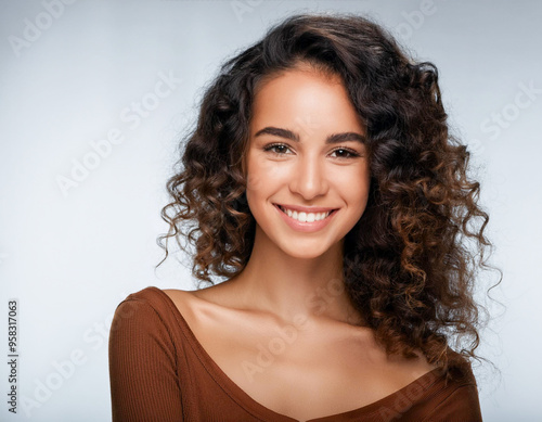 beautiful young smiling confident mixed race woman model with curly dark hair looking at camera with charming cute smile on grey white background