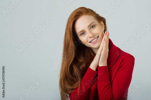 beautiful young smiling girl with red hair in a red sweater on a light background