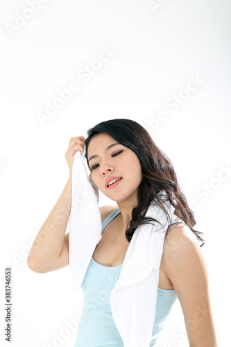 Beautiful young south east Asian Chinese woman workout exercise sweat towel on white background
