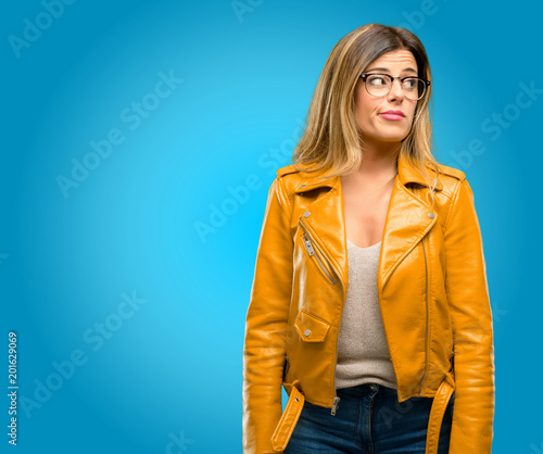 Beautiful young woman doubt expression, confuse and wonder concept, uncertain future, blue background