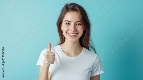 Beautiful young woman giving thumbs up and smiling on blue background.