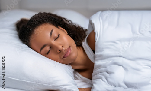 Beautiful young woman, happily asleep in a bed with clean white duvet and pillow. African-American woman enjoying peaceful, restful sleep.