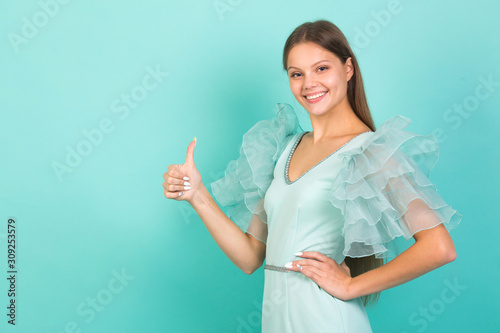 beautiful young woman in a blue dress on a blue background with hand gesture
