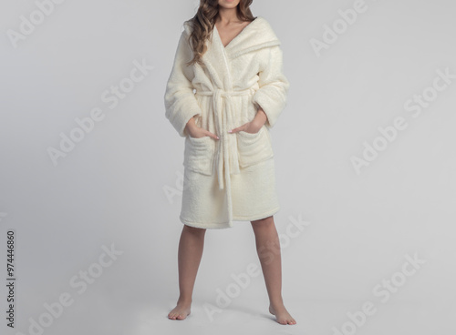 Beautiful young woman in a dressing gown on a white background.