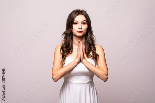 Beautiful young woman in casual clothes holding hands together and praying, isolated on white background