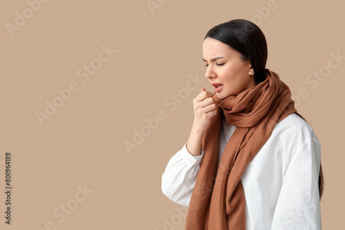 Beautiful young woman in scarf suffering from sore throat on brown background