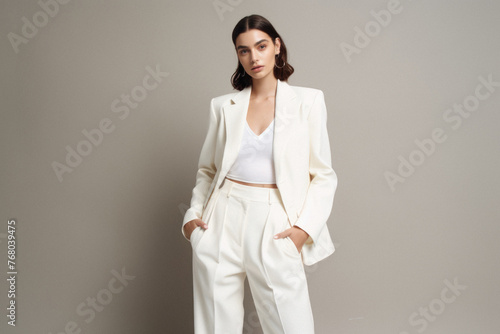 Beautiful young woman in white suit posing in studio, isolated on grey