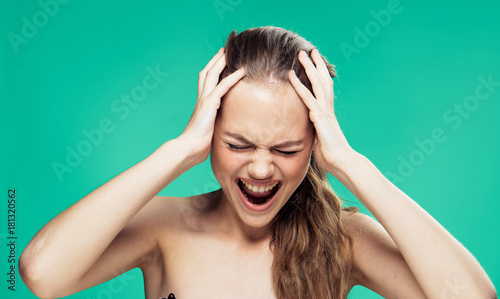 Beautiful young woman on a green background, scream, emotion, portrait