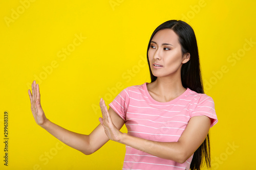 Beautiful young woman on yellow background