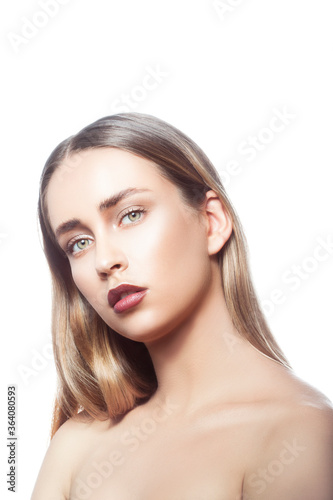 Beautiful young woman portrait, perfect skin, red cherry lips makeup, hair style