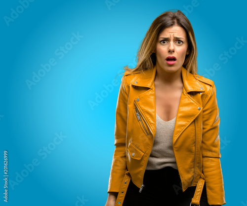 Beautiful young woman scared in shock, expressing panic and fear, blue background