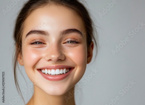 Beautiful young woman smiling with perfect teeth on a gray background, close-up portrait, beauty and skin care concept, copy space for text,