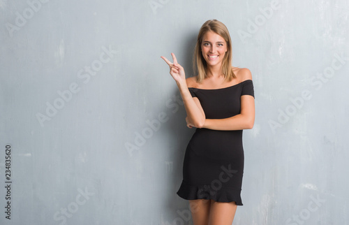 Beautiful young woman standing over grunge grey wall wearing elegant dress smiling with happy face winking at the camera doing victory sign. Number two.