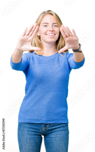 Beautiful young woman wearing blue sweater over isolated background Smiling doing frame using hands palms and fingers, camera perspective