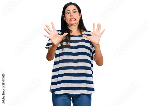 Beautiful young woman wearing casual clothes afraid and terrified with fear expression stop gesture with hands, shouting in shock. panic concept.