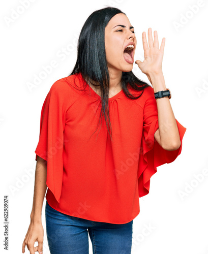 Beautiful young woman wearing casual clothes shouting and screaming loud to side with hand on mouth. communication concept.