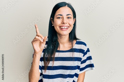 Beautiful young woman wearing casual clothes smiling with an idea or question pointing finger up with happy face, number one
