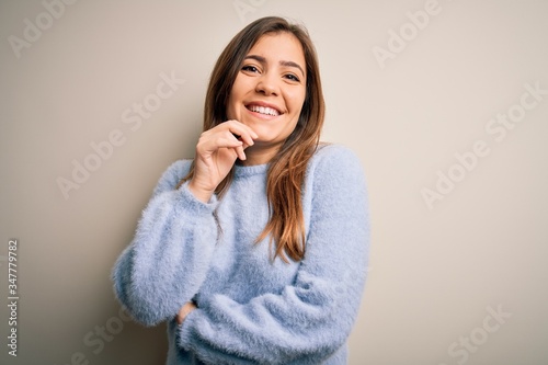 Beautiful young woman wearing casual winter sweater standing over isolated background looking confident at the camera with smile with crossed arms and hand raised on chin. Thinking positive.