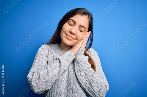 Beautiful young woman wearing casual wool sweater standing over blue isolated background sleeping tired dreaming and posing with hands together while smiling with closed eyes.
