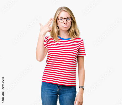 Beautiful young woman wearing glasses over isolated background Shooting and killing oneself pointing hand and fingers to head, suicide gesture.