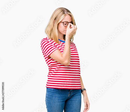 Beautiful young woman wearing glasses over isolated background tired rubbing nose and eyes feeling fatigue and headache. Stress and frustration concept.