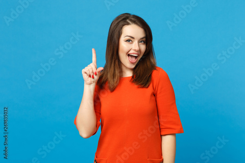 Beautiful young woman wearing red orange dress holding index finger up with great new idea isolated over trendy blue background, studio portrait. People lifestyle fashion concept. Mock up copy space.