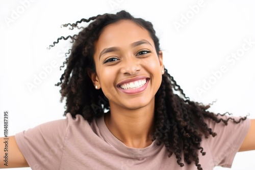 Beautiful young woman with an Afro hairstyle smiling at the camera while standing against a white background. Happy woman of color wearing her natural curly hair with pride.