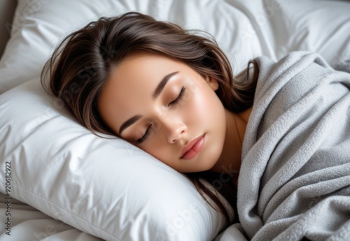 Beautiful young woman with brunette hair sleeping under a gray blanket, resting on a white pillow with closed eyes