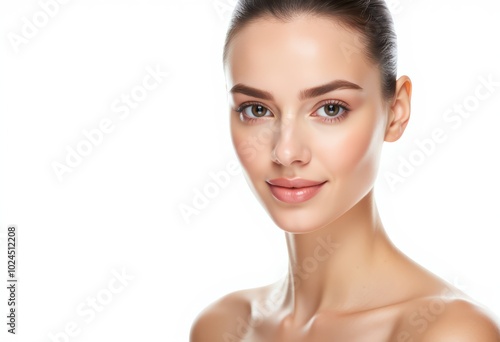 Beautiful young woman with clean skin and natural makeup, isolated on white background.