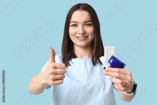 Beautiful young woman with contraceptive pills and condom showing thumb-up gesture on blue background. AID awareness concept