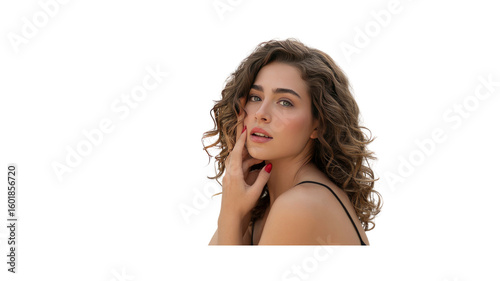 Beautiful Young Woman with Curly Hair and Red Nails