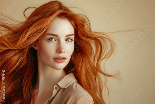 Beautiful young woman with flowing red hair and freckles looking at camera with gentle smile. Natural beauty portrait perfect for cosmetic, fashion, and lifestyle advertising.