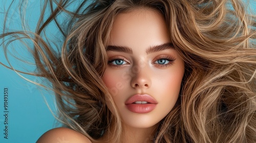 Beautiful young woman with long blonde hair and blue eyes. She is looking at the camera with a soft expression. Her hair is flowing in the wind.