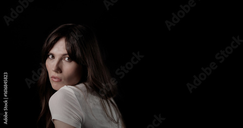 Beautiful young woman with long brown hair wearing white t shirt looking over her shoulder on black background