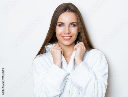 beautiful young woman with long hair wearing bath robe and posing on grey background with copy space