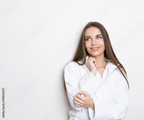 beautiful young woman with long hair wearing bath robe and posing on grey background with copy space