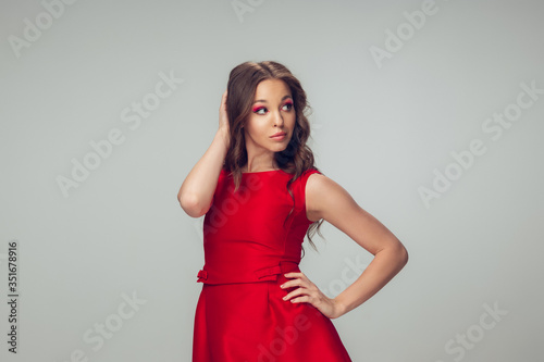 Beautiful young woman with long healthy curly hair and bright make up wearing red dress isolated on grey studio backgroud. Beauty and fashion, hair and skin care, treatment concept. Well-kept girl.