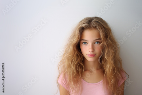 Beautiful young woman with long wavy red hair, smiling, dressed casually, looking at the camera. A good-looking beautiful woman isolated on a blank white wall.