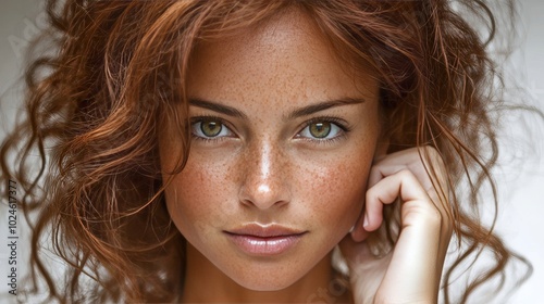Beautiful Young Woman with Red Hair, Freckles, and Green Eyes. Natural Beauty Portrait.
