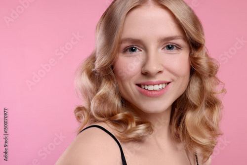 Beautiful young woman with shiny healthy hair on pink background