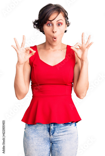 Beautiful young woman with short hair wearing casual style with sleeveless shirt looking surprised and shocked doing ok approval symbol with fingers. crazy expression