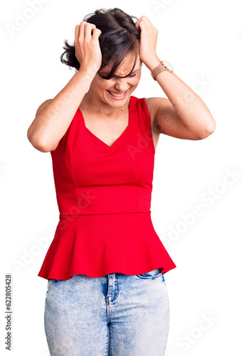 Beautiful young woman with short hair wearing casual style with sleeveless shirt suffering from headache desperate and stressed because pain and migraine. hands on head.