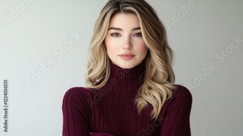 Beautiful young woman with wavy blonde hair in a maroon knitted turtleneck sweater, posing against a soft grey background with crossed arms, beauty concept.