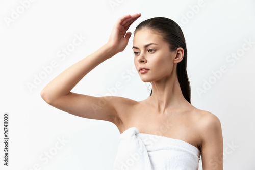Beautiful young woman with wet hair posing thoughtfully against a clean white background, conveying elegance and tranquility in a serene atmosphere, perfect for beauty or lifestyle themes
