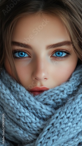 Beautiful young woman wrapped in a cozy scarf with striking blue eyes in a winter setting