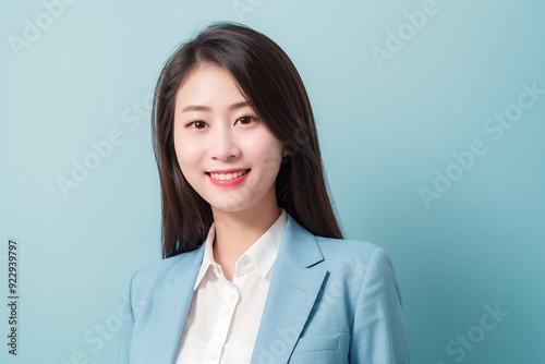 Beautifull Asian Young Woman Smiling and Laughing, Blank White and Blue, Business Woman Attractive Smile