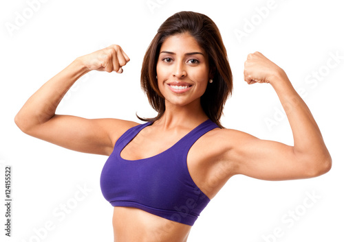 Beautifully fit young Hispanic Latin woman girl flexing muscles in sports braw isolated on white background